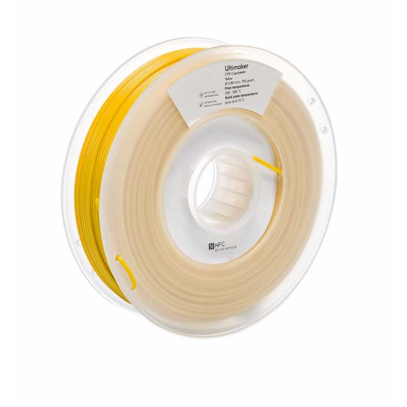 Ultimaker's CPE material is ideal when producing parts requiring mechanical properties and good chemical resistance while maintaining ease of printing. This Ultimaker CPE Yellow filament has high flexural strength (2100 MPa) and tensile strength (38 MPa).
