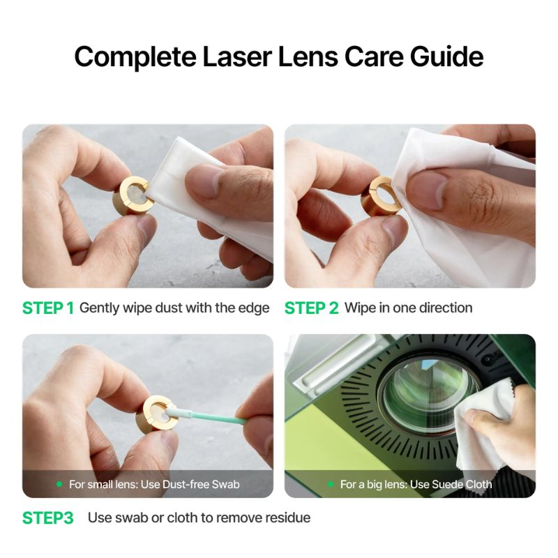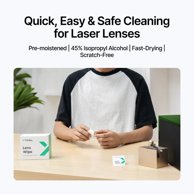 For best results, use the wipes or cloths dry and handle the lenses with care. Clean your lenses regularly to extend their lifespan and maintain top engraving and cutting quality. This kit is perfect for both hobbyists and professional users seeking thorough and safe maintenance of their xTool laser equipment.