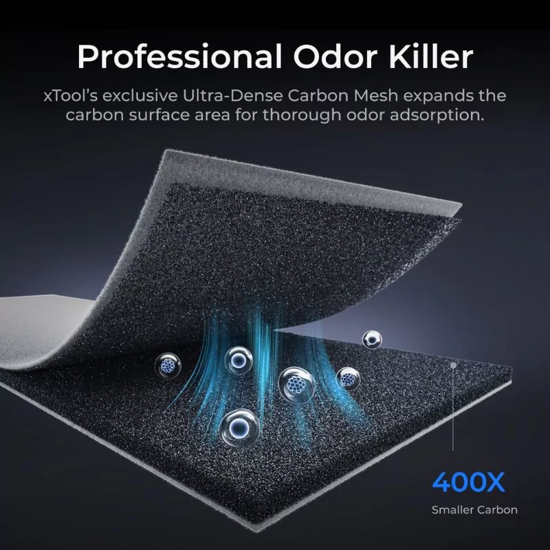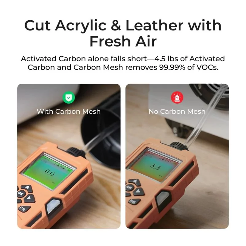 The purifier is equipped with an ultra-dense carbon mesh, capable of absorbing up to 97.97% of odors and capturing 84.4% of harmful fumes. This feature is essential for neutralizing the unpleasant emissions produced when cutting or engraving certain materials, thus enhancing the user's comfort and the ambient air quality.