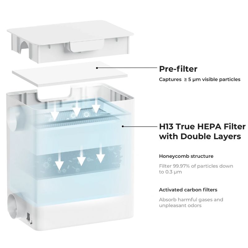 The HEPA filter, known for its efficiency, captures 99.97% of fine particles ranging from 0.3 to 5 microns, including smoke and microscopic pollutants. Finally, the activated carbon neutralizes volatile organic compounds (VOCs) and unpleasant odors, ensuring complete air purification.