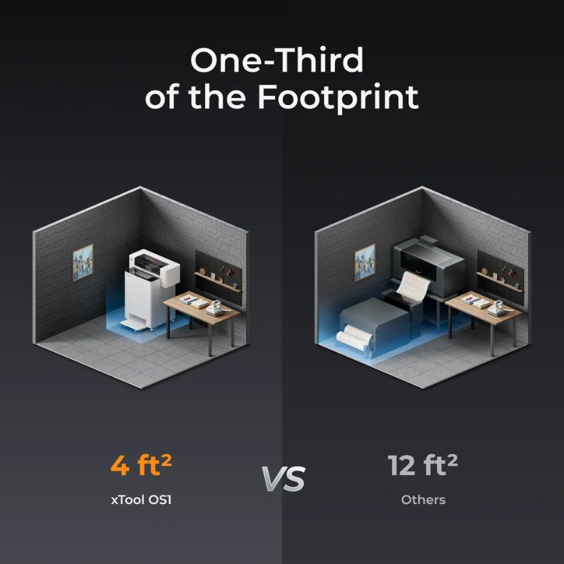 With only 1.2 m² of space required, the xTool OS1 occupies one-third of the space compared to competing machines.